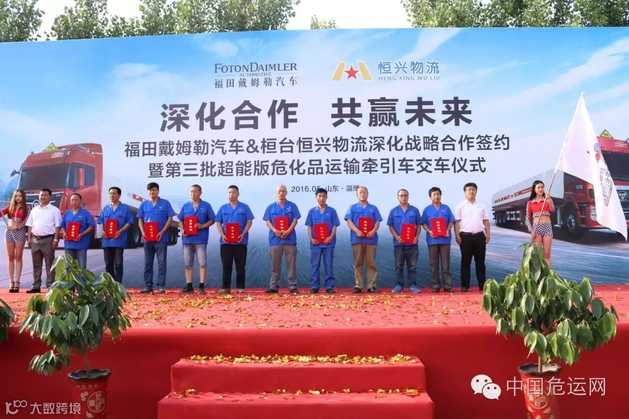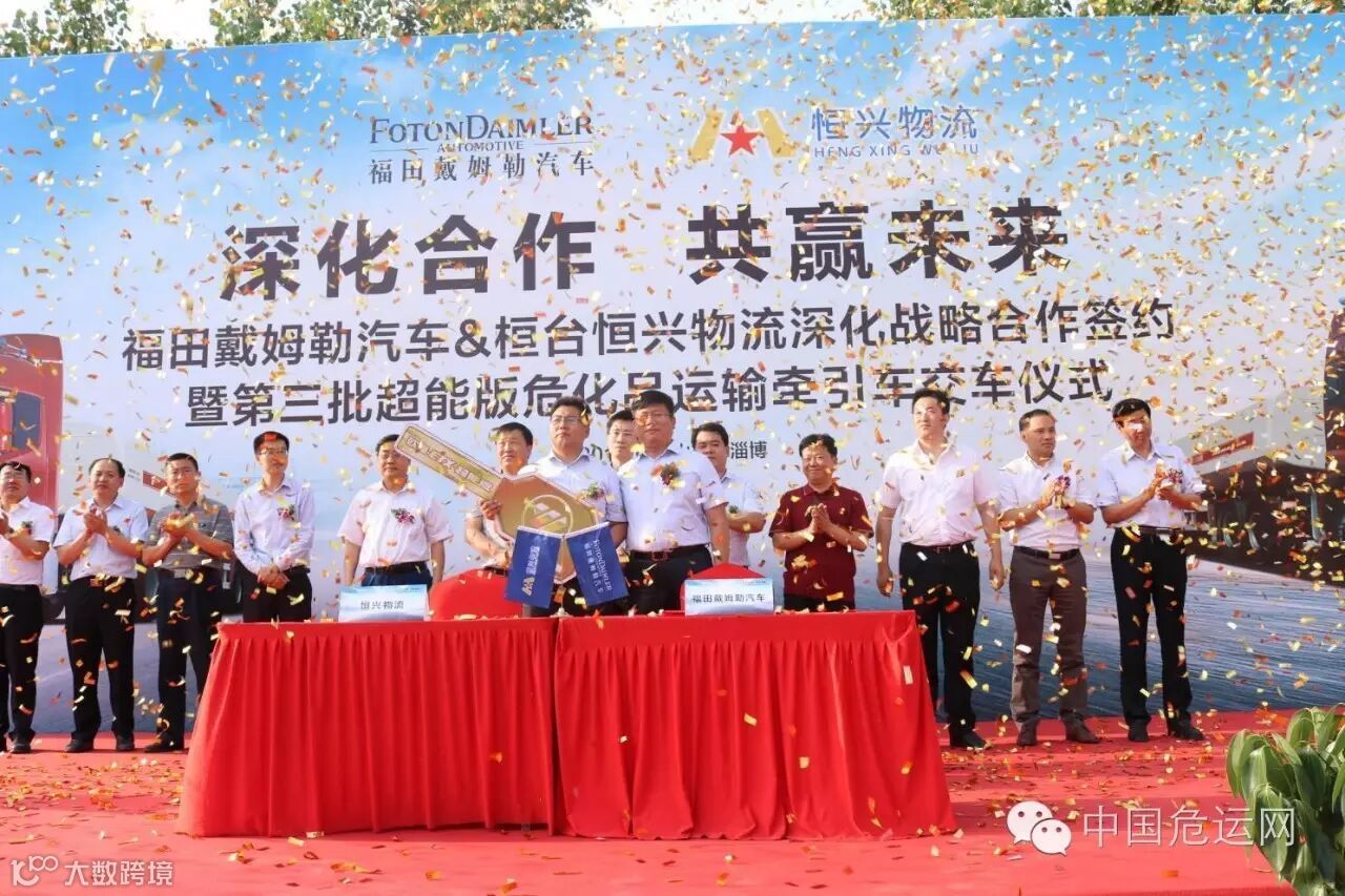 5月30日,以“深化合作 共赢未来”为主题的福田戴姆勒汽车&桓台恒兴物流深化战略合作签约暨第三批超能版危化品运输牵引车交车仪式在淄博桓台隆重举行。同时,来自交通运输部科学研究院物流研发中心、中物联危化品分会专家、福田戴姆勒汽车、车联网企业、危化品生产品企业、淄博当地危化品车队客户、全国主要危化品客户以及媒体代表到危化品运输的标杆企业恒兴物流进行参观学习,并就打造“一体化”的危化品运输安全解决方案进行合作交流。这也标志着福田戴姆勒汽车在提供高端危化品运输装备的同时,致力于为危化品运输上下游企业搭建政策宣贯、价值培训、业务对接、经验共享、交流学习的平台,引领危化品运输行业安全高效发展。