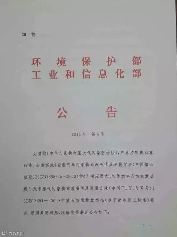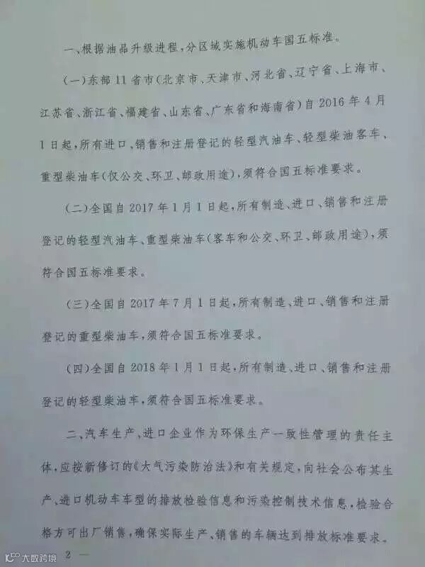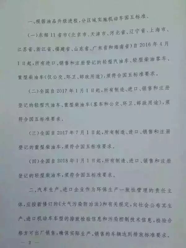 为贯彻《中华人民共和国大气污染防治法》,严格控制机动车污染,全面实施《轻型汽车污染物排放限值及测量方法(中国五阶段)》(GB18352.5-2013)和《车用压燃式、气体燃料点燃式发动机与汽车排气污染物排放限值及测量方法(中国Ⅲ、Ⅳ、Ⅴ阶段)》(GB17691-2005)中第五阶段排放标准(以下简称国五标准)要求,经国务院同意,现就有关事宜公告如下: