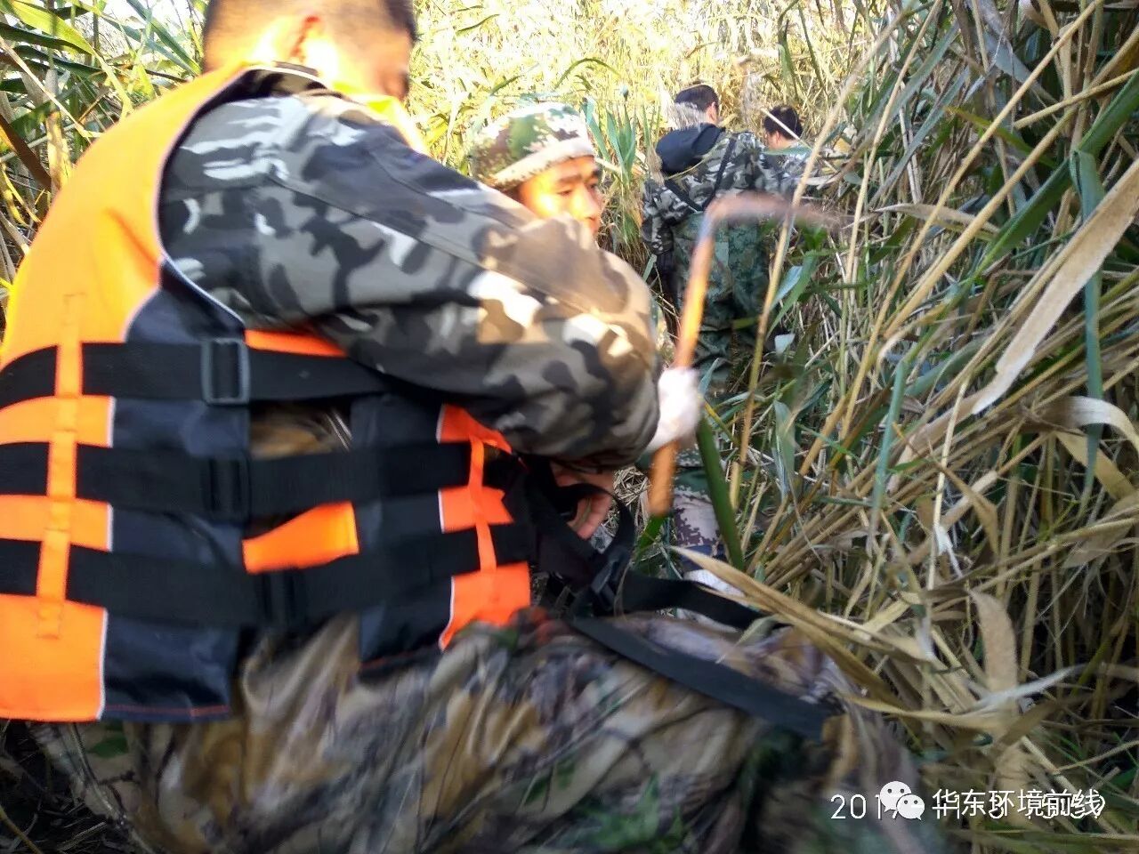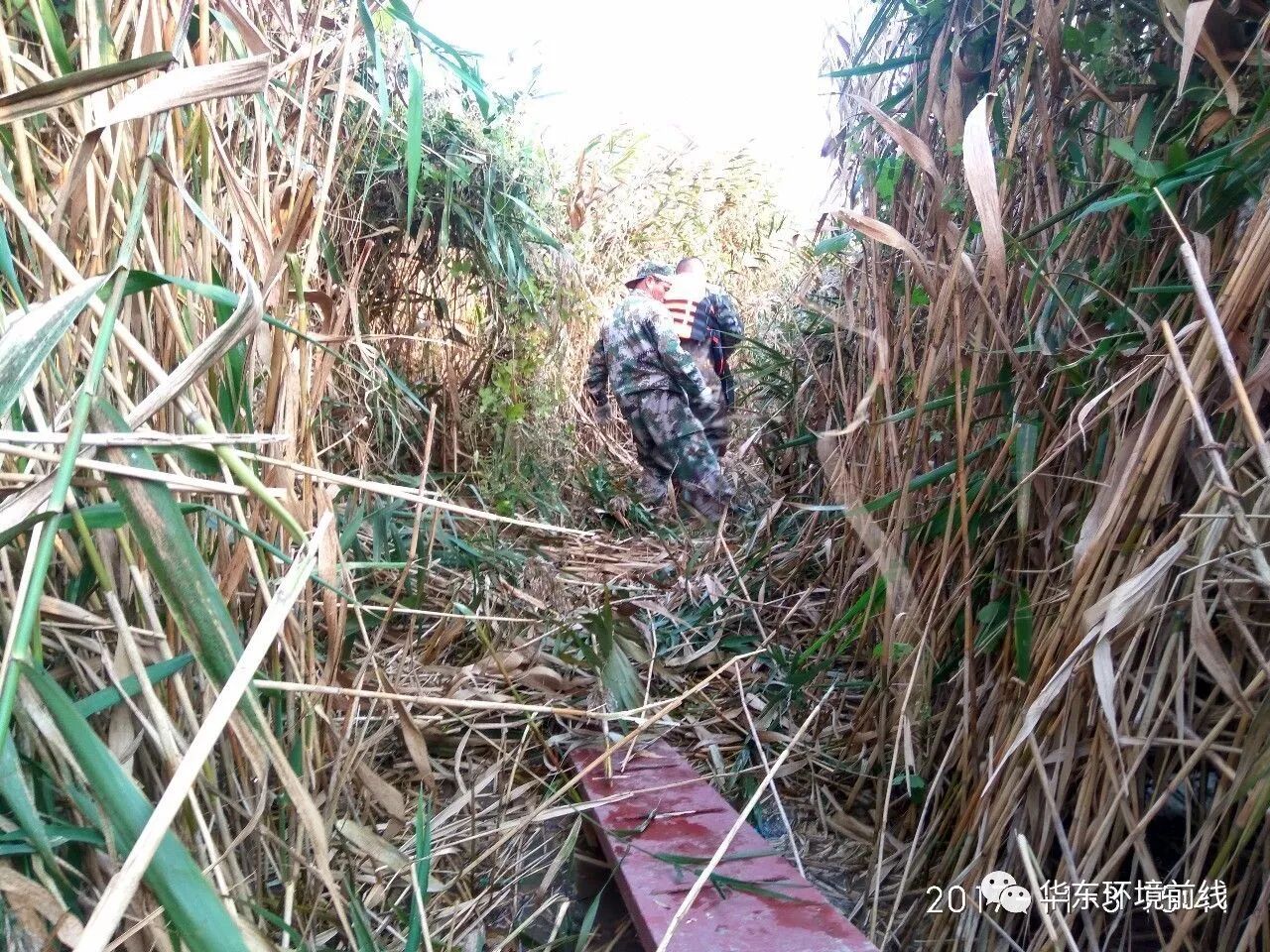 连云港市水利局的船带领大家行驶半个小时,水利局工作人员和无痕老师大概判断盗猎窝点方位,根本没有路,船只缓慢靠近岸边,茂盛的芦苇丛中,市林业局的工作人员和志愿者冒着危险用镰刀艰难的开路。