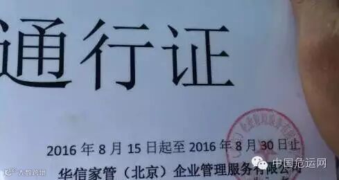 通行证的落款单位为,华信家管(北京)企业管理服务有限公司,法人为:刘亚飞。