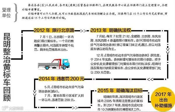 昆明市环保局介绍,截至目前,昆明市还剩4万余辆黄标车需在今年年底前淘汰。为鼓励黄标车所有人提前淘汰其车辆,持续改善空气质量,《昆明市黄标车提前淘汰补贴办法》已于今年4月正式印发,黄标车提前淘汰补贴的工作由各县(市)区具体开展实施,符合条件的申请人何时可以申报补贴,可具体关注各县(市)区的通知发布。