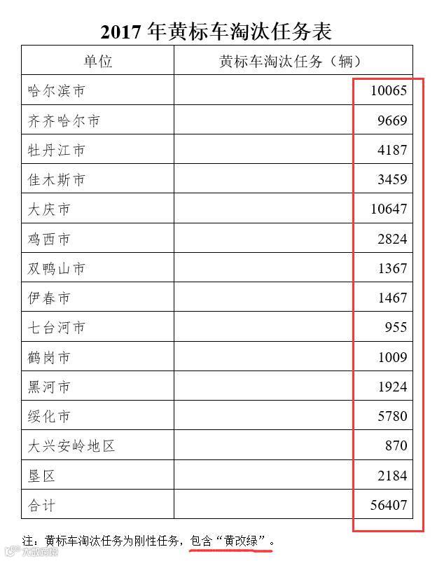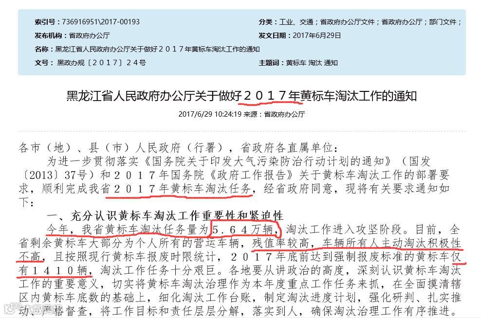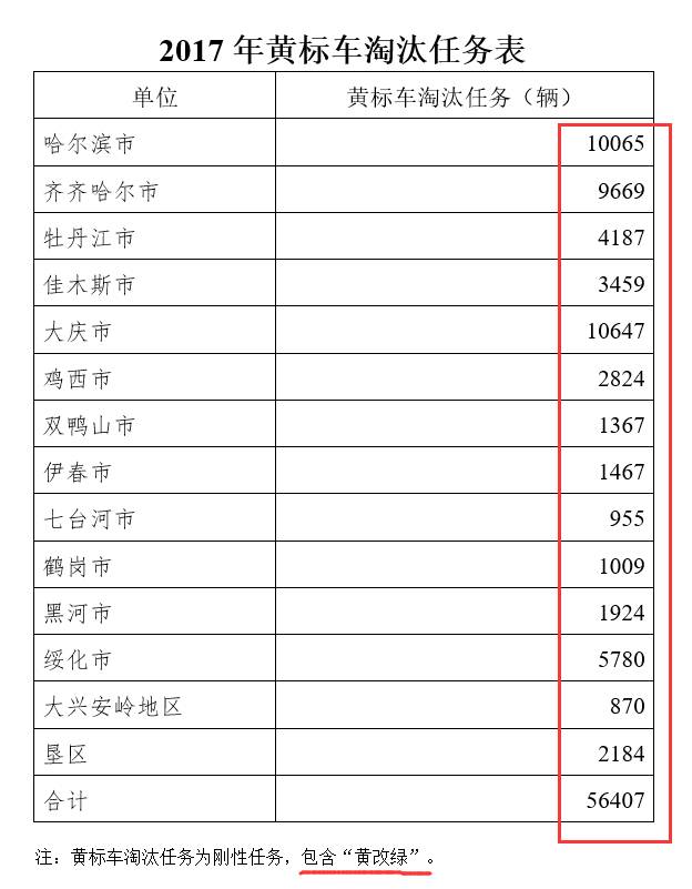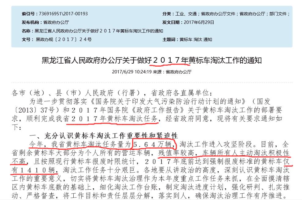 2017年6月29日,黑龙江省下达2017年黄标车淘汰工作的通知,2017年黑龙江省黄标车淘汰任务量为5.64万辆,而目前只完成了1410辆。