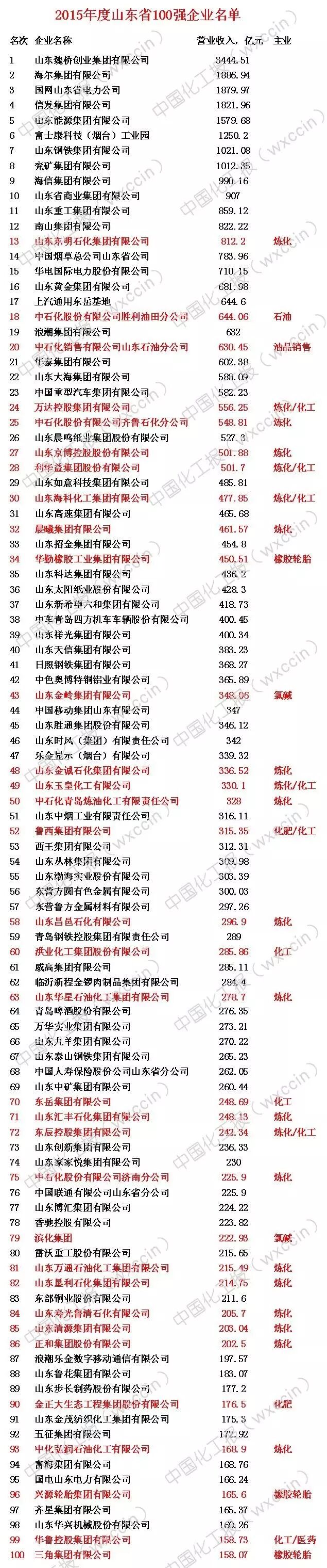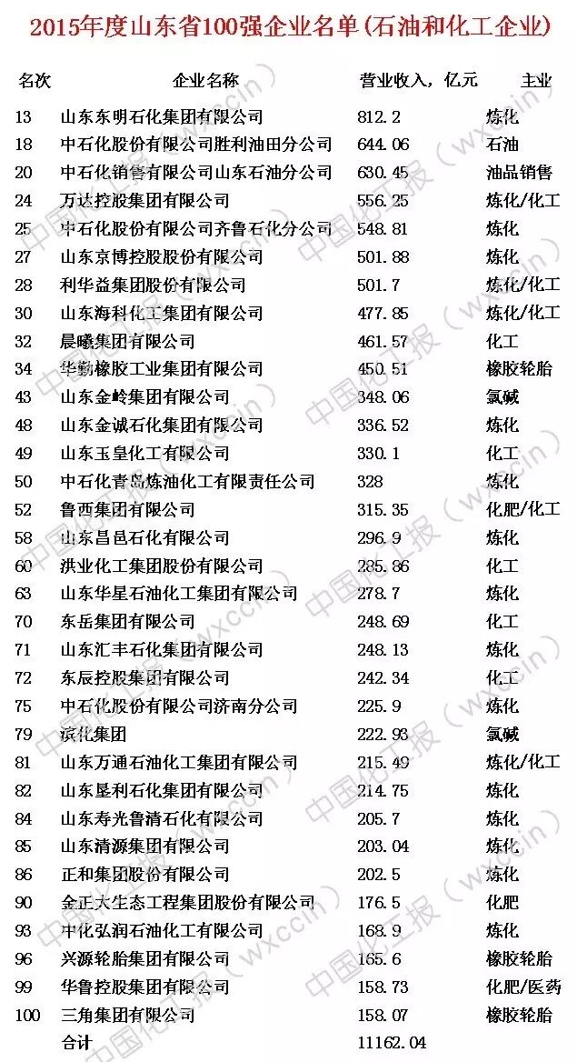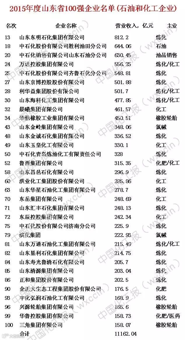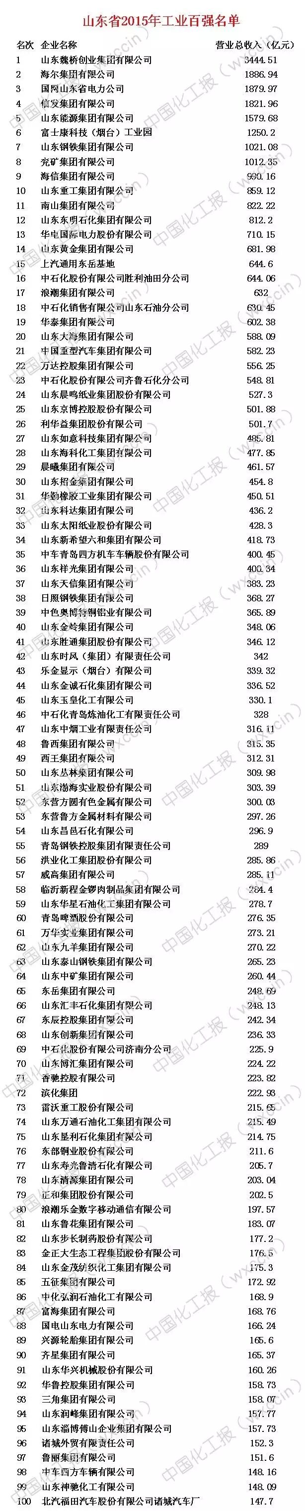 8月17日,山东省经信委、山东省统计局公布了2015年度山东省百强企业名单,其中石油和化工企业占据33席,占比达到1/3,营业收入超过11162亿元,充分展示了化工第一大省的综合实力。