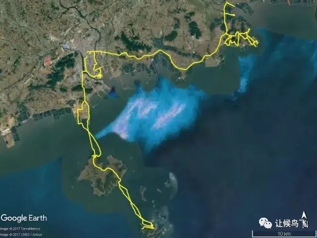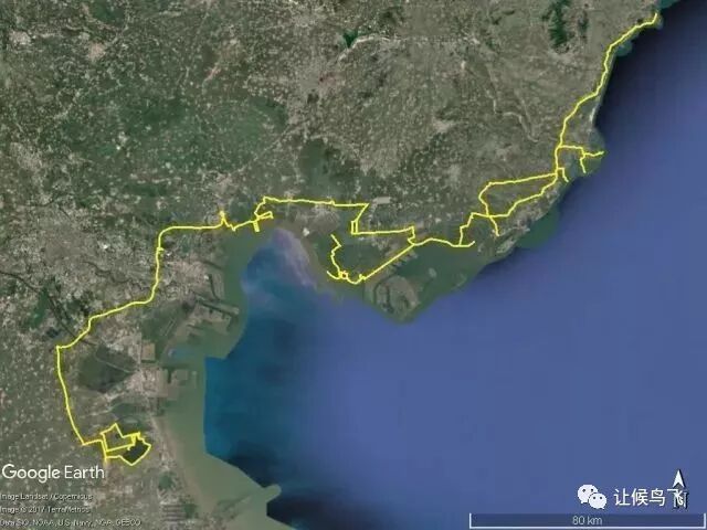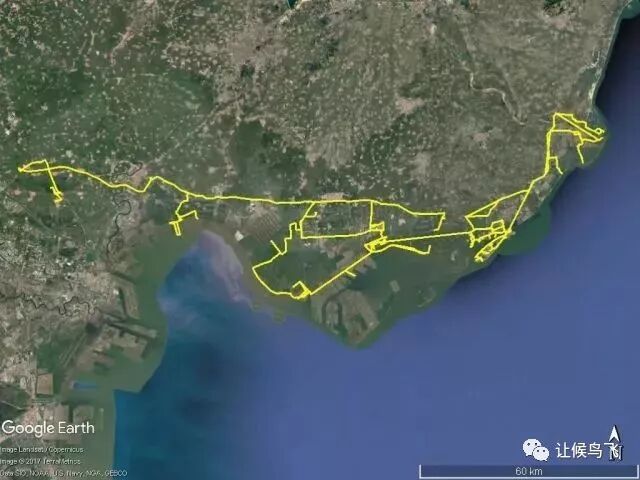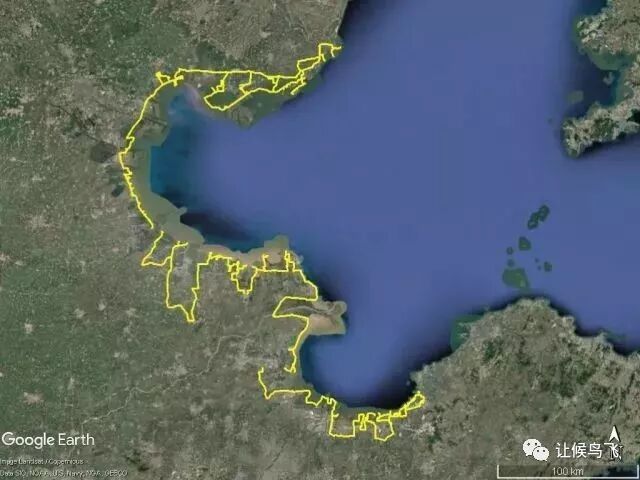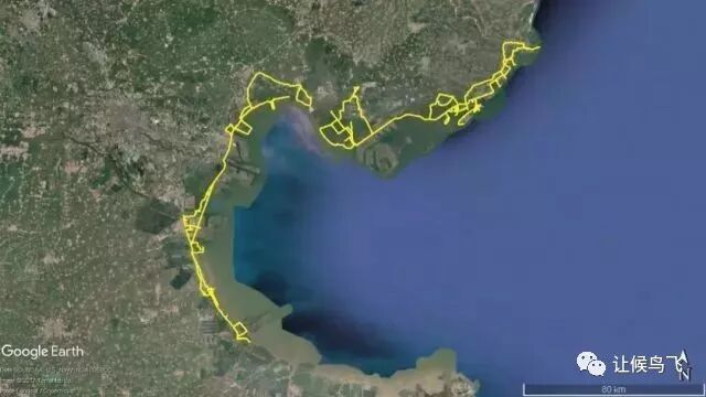 10月下旬,大连庄河滨海湿地鸟类专项调查工作轨迹叠加图,调查里程176公里,包括驾驶、乘船、徒步等多种交通工具