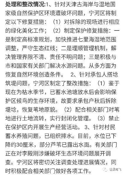 1、针对七里海湿地破坏的举报及公示的调查与处理整改情况: