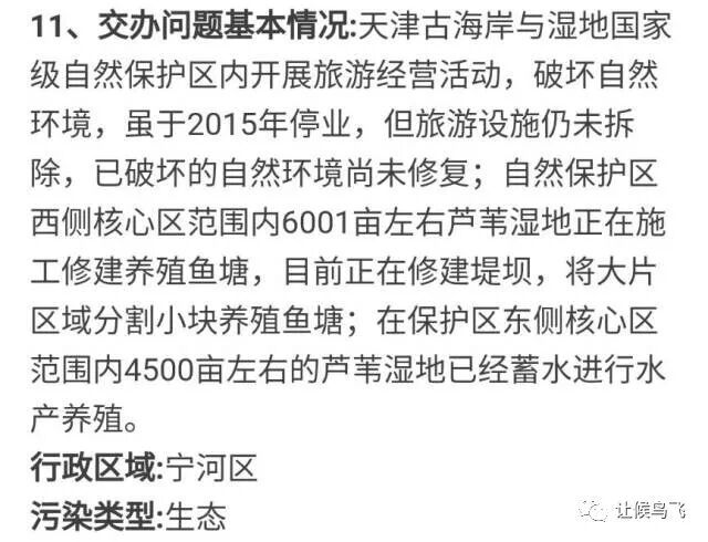 向入驻天津的中央第一环保督察组举报七里海湿地和汉沽滨海湿地的生态破坏问题,有关部门已公示调查结果并提出了处理整改情况的反馈。