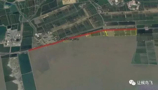 上图中红色实线为生态红线划定的位置,黄色区域为围垦养殖区域,总面积165公顷