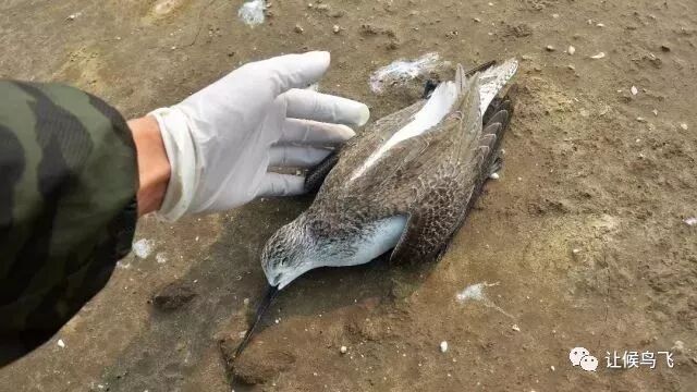 巡护中,在河北滦南南堡村附近发现多只因误食水厂养殖池塘中食物导致死亡的鸟类,上图是其中的一直泽鹬,发现地点位于一处养虾的池塘中