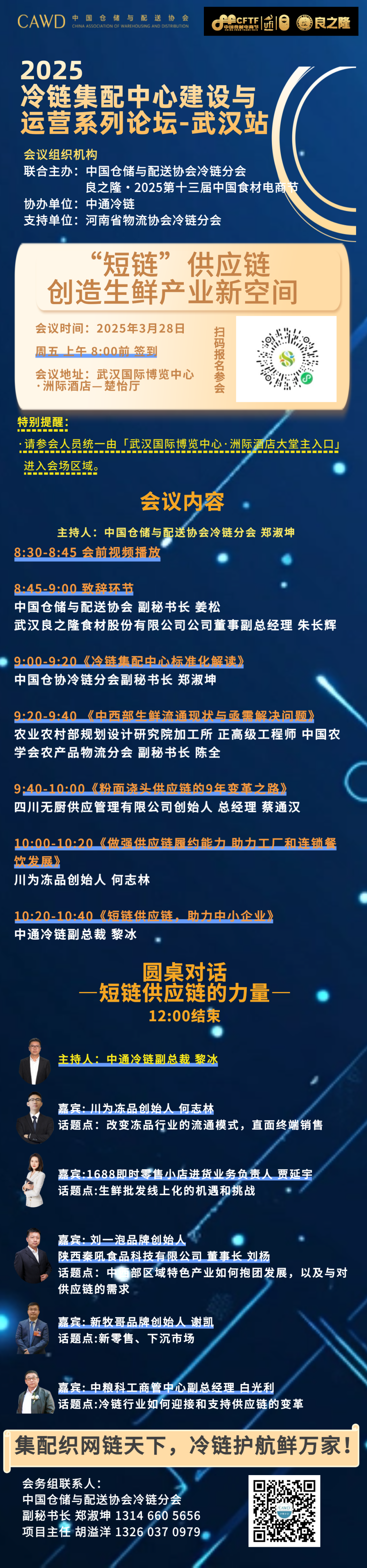 生鲜产业正经历一场以“短链化”为核心的供应链变革浪潮!为共同探索如何通过供应链创新释放产业新价值、满足消费新需求,3月28日,中通冷链联手中仓协冷链分会在武汉良之隆食材电商节举办《短链供应链 创造生鲜产业新空间》主题论坛,汇聚行业领袖,诚邀行业先锋、共享实战经验、共谋产业未来!