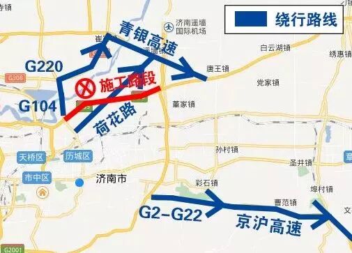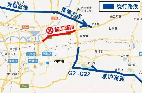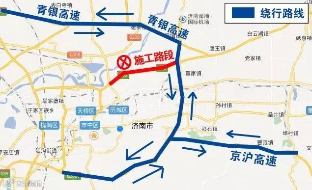 延青银高速(G20)主线去往济南、聊城、京台高速(G3)前行至小许家经京沪高速(G2)进行转换。