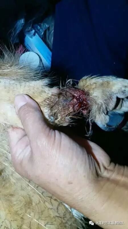 从家中返回的杨园长立即对雕鸮开展治疗,经检查雕鸮左腿被兽夹夹断两处,一处开放性伤口进行了清创处理,大腿骨处离断骨折,进行了紧固,并填喂食物。