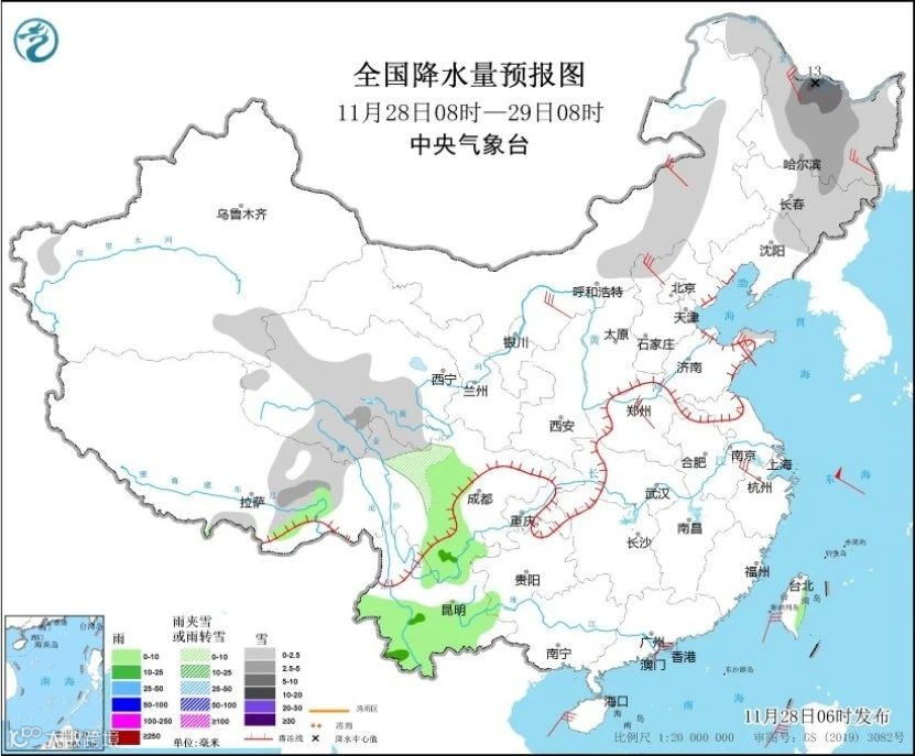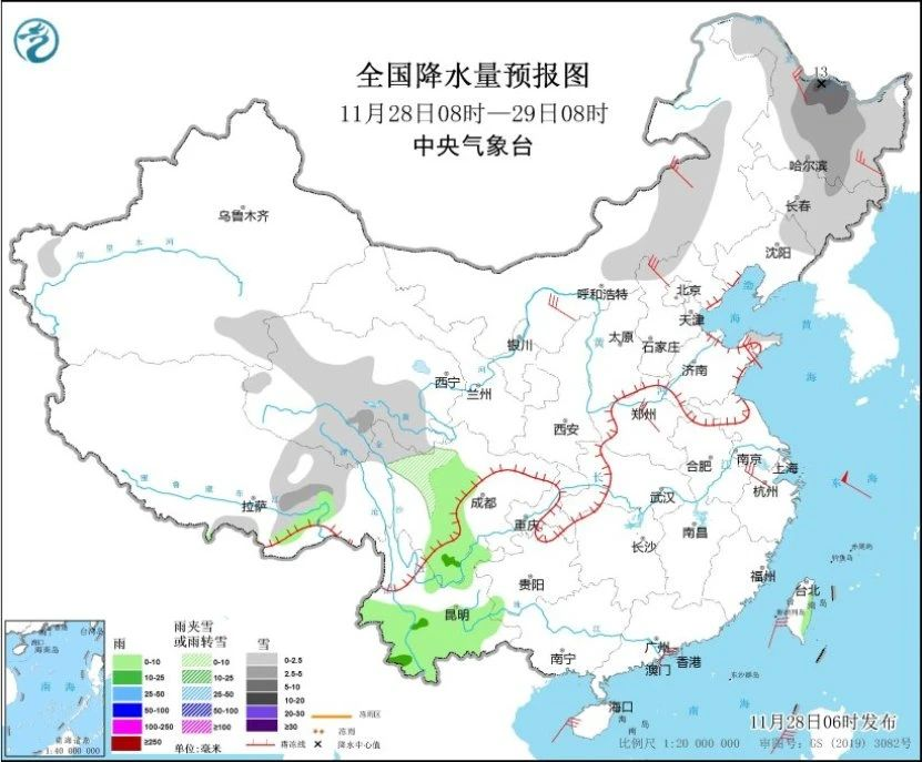 您好!据中央气象台消息,受寒潮影响,11月28日08时至29日08时,黑龙江大部、吉林中东部、辽宁北部、西藏东部、青海中部和南部、川西高原北部等地部分地区有小雪或雨夹雪,其中,黑龙江中北部、吉林中北部、西藏东部、青海南部等地部分地区有中到大雪,黑龙江中北部局地暴雪(10~13毫米)。