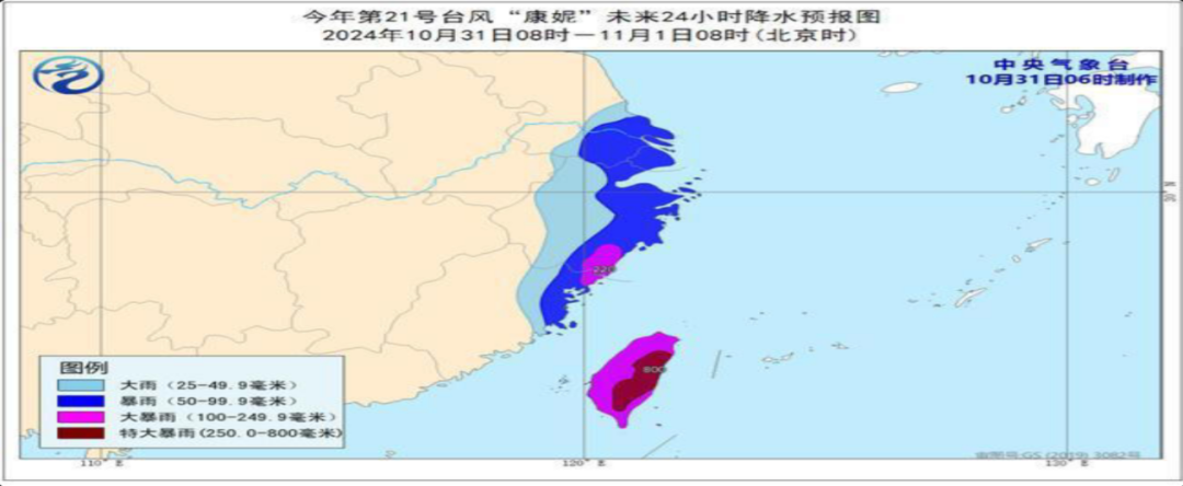 毫米);台湾岛有大暴雨,台湾岛东部的部分地区有特大暴雨(