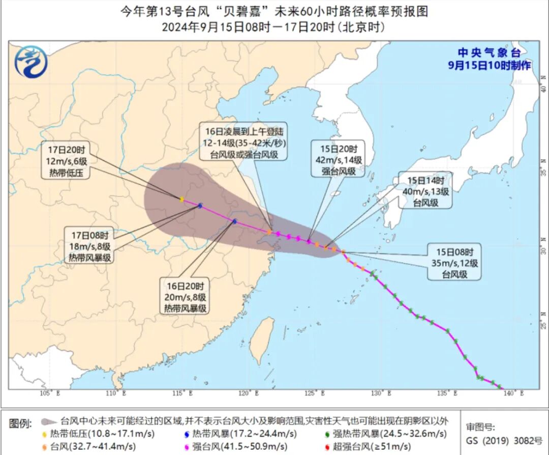 大风预报:9月16日08时至17日08时,黄海南部、东海西部、浙江北部、江苏中部和南部、安徽东部将有6~8级、阵风9~10级的大风,东海西北部、上海及其沿海、江苏东南部及其沿海、浙江东北部及其沿海、杭州湾、长江口区、舟山群岛附近海域将有9~11级、阵风12~13级,“贝碧嘉”中心经过的附近海域或地区风力可达12~14级、阵风15~16级。