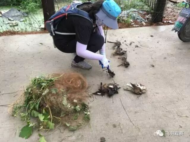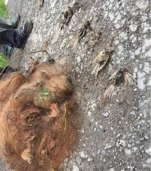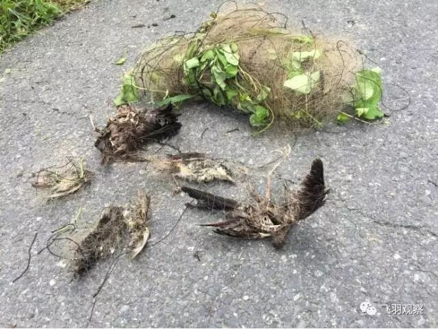 第一户果园拆除的4片鸟网以及伯劳、麻雀等5具鸟尸
