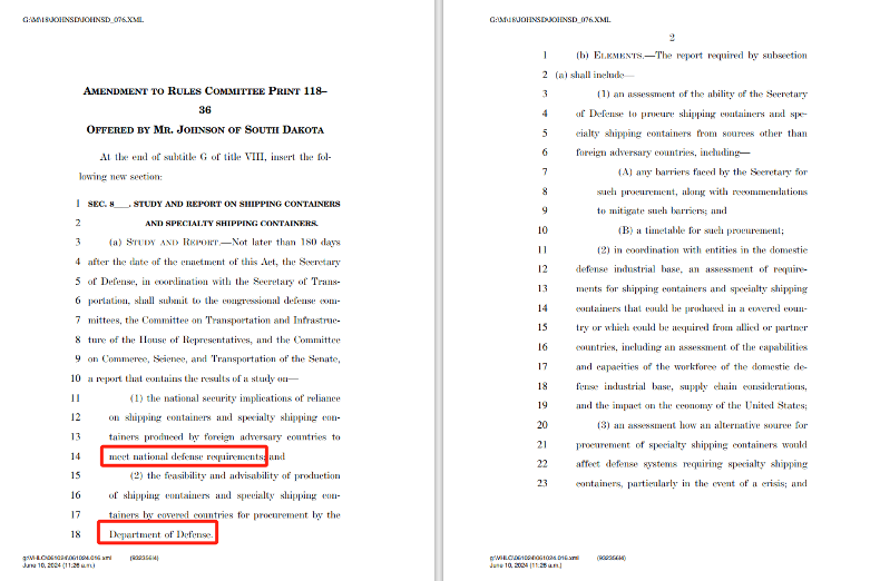 2024年7月2日,美国众议院议员、南达科他州共和党人达斯蒂·约翰逊(Dusty Johnson)在国防法案中提出一项修正案,即Amendment 346,旨在呼吁国会研究中国在集装箱生产领域的垄断地位,并加大力度审查中国生产的集装箱在美国的使用情况。