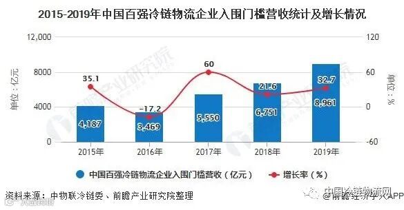 从百强冷链企业入围门槛营收来看,2019年冷链物流百强企业入围门槛营收为8961万元,较上年提高2210万元,涨幅达到32.7%。除2016年受经济形势影响入围门槛营收有所回落外,其余年份冷链物流百强企业入围门槛保持逐年上升,表明冷链物流企业竞争越来越激烈,反映出整体冷链物流企业不断发展壮大。