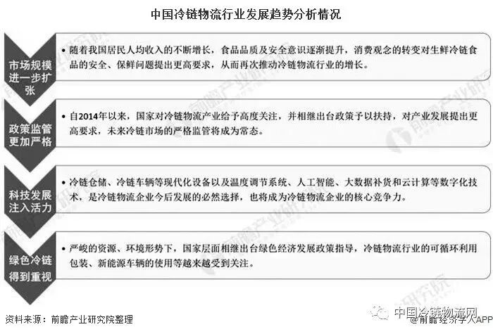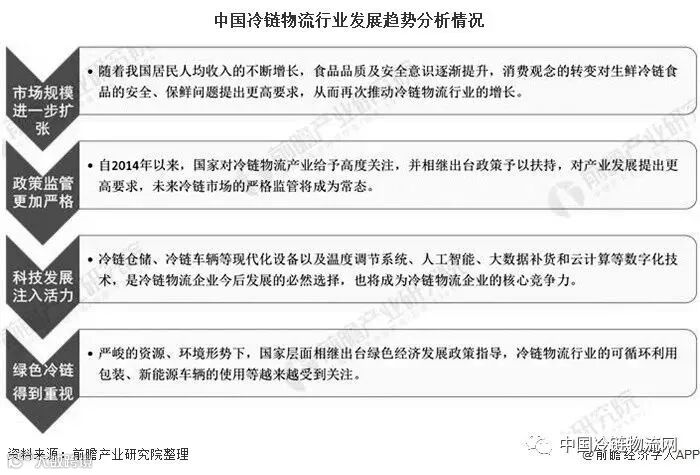 伴随着国内消费水平的不断提升,中国冷链物流行业发展业进入新的阶段,未来冷链物流的发展规模将持续增长,行业严格监管、现代技术的深入应用和绿色发展将是我国冷链物流行业的主要发展趋势,推动冷链物流转型升级,中国冷链物流行业进入快速提升时期。