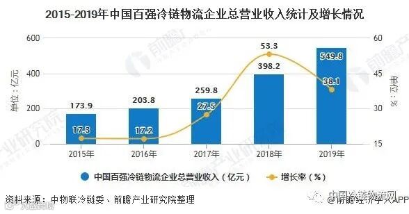 从百强冷链企业业务总营收来看,2015-2019年国内冷链业务发展迅速,百强企业营收规模不断扩大,年复合增长率达29.96%。2019年百强企业冷链业务营业收入合计达549.8亿元,同比增长38.1%。
