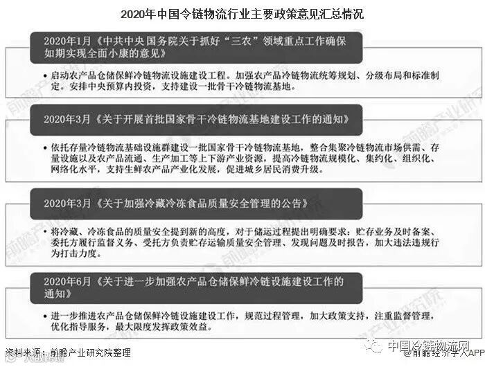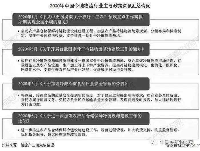 2020年以来,政府对冷链物流的政策意见出台非常密集,对冷链物流建设发展密切关注,主要涉及冷链物流基地的发展、冷链质量安全管理、推进农产品冷链设施建设等方面,一系列政策意见的出台都给中国冷链物流行业的发展带来比较好的政策环境。