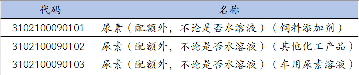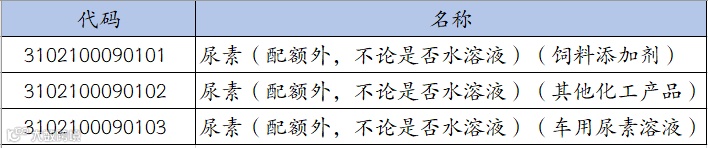 3102100010为进口配额内尿素,进口税率4%,监管条件为t/A/B;3102100090为进口配额外尿素,进口税率50%,监管条件为A/B,出口时应申报该税号,出口退税税率为0%。