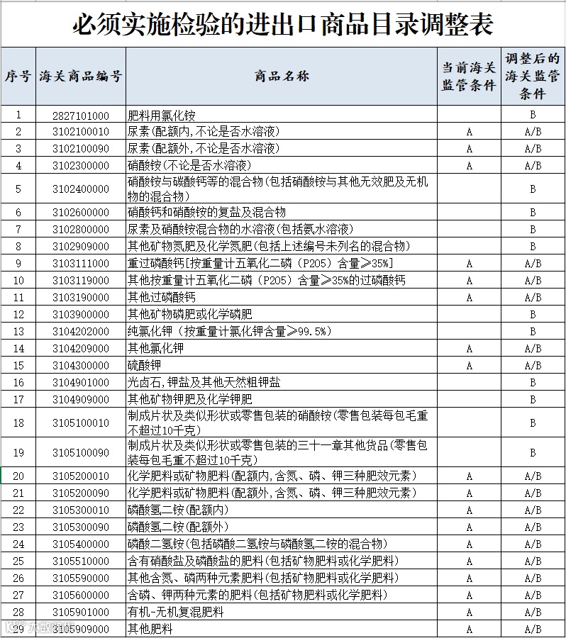 根据《中华人民共和国进出口商品检验法》及其实施条例,海关总署决定自2021年10月15日起,对必须实施检验的进出口商品目录进行调整,对涉及出口化肥的29个10位海关商品编号增设海关监管条件“B”,海关对相关商品实施出口商品检验。