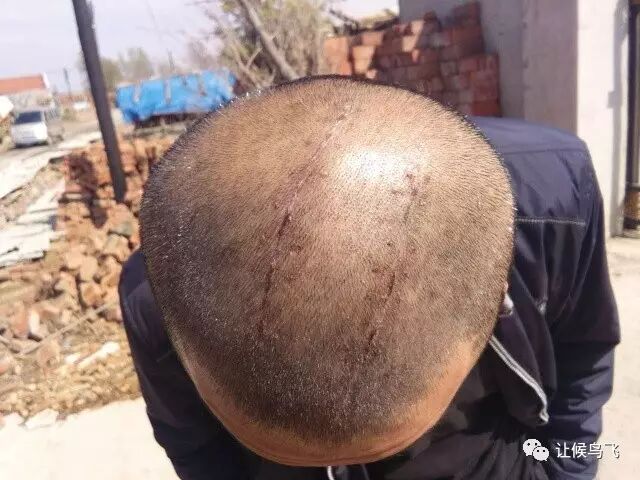 “2017年4月14日,米先生起床很早,他与朋友约好一起去榛子园,他和朋友把面包车停在山下,一前一后向上走去,朋友回车去取东西,他自己径直向山上走去,来到半山腰,距离榛子园的“大雕窝”还有一段路的时候,他感觉头顶被什么东西重击了一下,头顶血流不止,被雕鸮的爪子抓开两个20厘米左右的大口子!经开原中医院紧急救治,昨天才拆线出院”