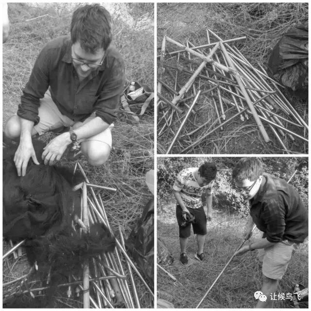 在发现网道后不久就发现了捕鸟的。向森林公安举报后在捕鸟人停车的地方等,不一会就开始下雨了,见捕鸟人开始收网要撤,就上前查看。