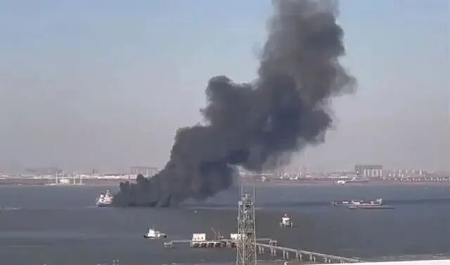 网友发布的视频显示,离桥面不远的水面上,一艘船舶冒出大面积浓浓黑烟,该船舶两侧分别有两条船在水面附近。还有一段疑似在周边路过船只上拍摄的视频显示,冒烟的船只已经倾斜,船边有橙色的疑似逃生艇漂在水面。