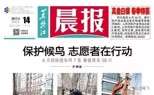 东北护鸟天团登上黑龙江晨报4月14日头版头条:保护候鸟,志愿者在行动!