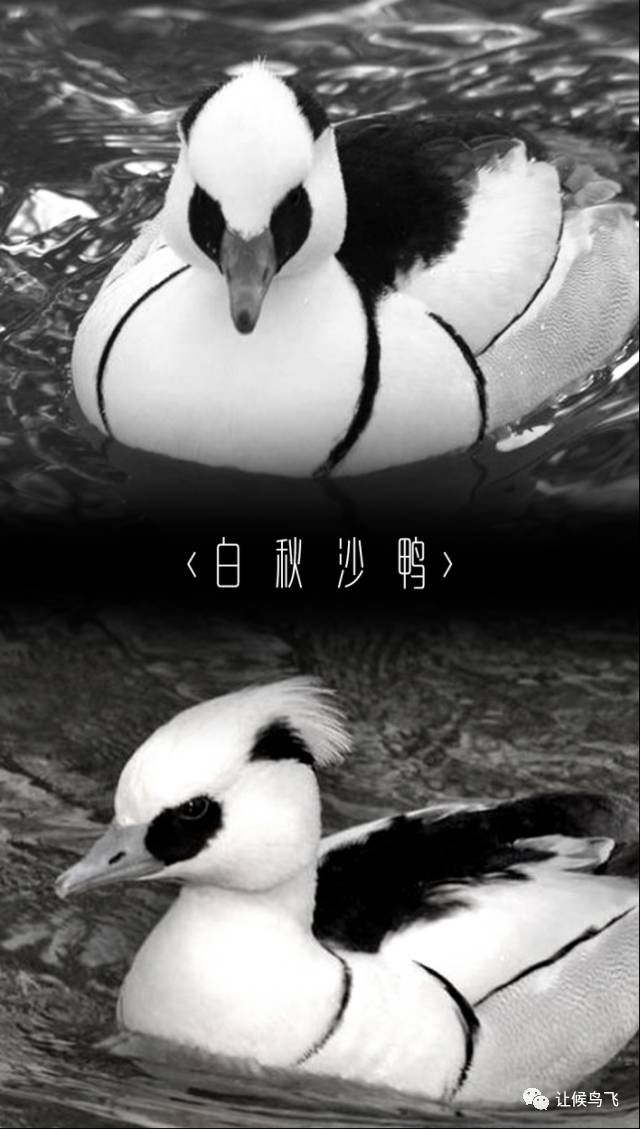 帅吧!白秋沙鸭的体型并不大,身长约42厘米,雄鸟的全身以黑白色为主,也是个渴望拥有彩色照片的物种。全身只有眼部、枕部、后背为黑色,嘴、脚、腰部和尾部为灰黑色,其余地方为白色,是典型的白马王子。