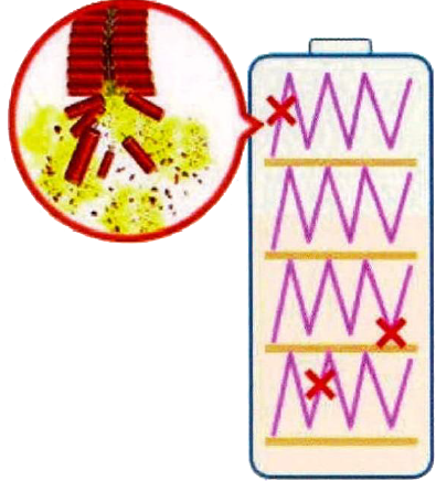 一是内部因素。主要是内部短路,比如正负极片上微粉或凸点刺穿隔膜,引起内部短路;或是粘结剂不合格,产生掉粉,形成毛刺造成隔膜穿刺,导致内部短路。