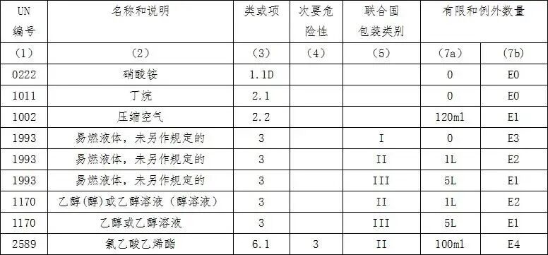 2.每个UN编号对应的有限数量(7a)一栏都有一个具体的数值和单位,“有限数量运输”的单一内包装或物品所盛装的危险货物数量不可超过此上限。