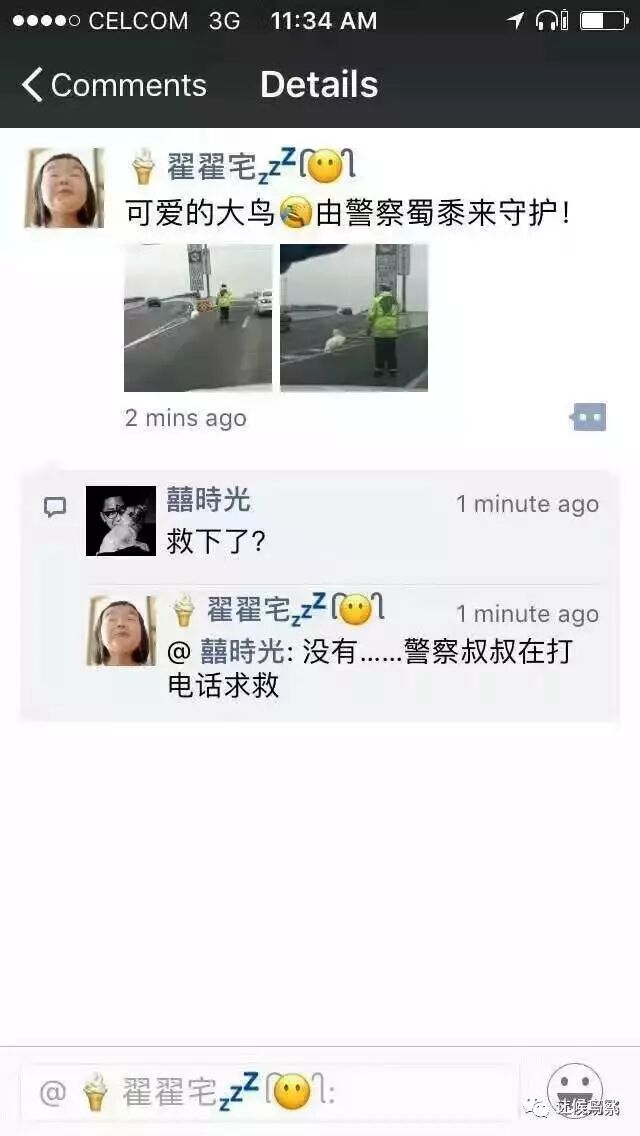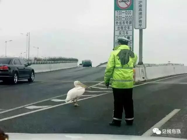 上午11:34,网友在高架桥上拍到一只鹈鹕站在高架分路口,一位警察蜀黍站在鹈鹕边上指挥过往的车辆。由于在高架上不能停车,网友只好发微信朋友圈求助。