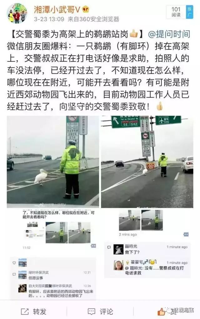 13:09,@湘潭小武哥V 微博:【交警蜀黍为高架上的鹈鹕站岗】@提问时间 微信朋友圈爆料:一只鹈鹕(有脚环)掉在高架上,交警叔叔正在打电话好像是求助,拍照人的车没法停,已经开过去了,不知道现在怎么样,哪位现在在附近,可能开去看看吗?有可能是附近西郊动物园飞出来的,目前动物园工作人员已经赶过去了,向坚守的交警蜀黍致敬!