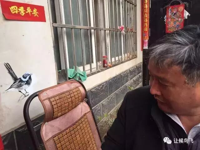 2017年2月,宋克明在家中。女儿在墙壁上画了好些鸟儿。