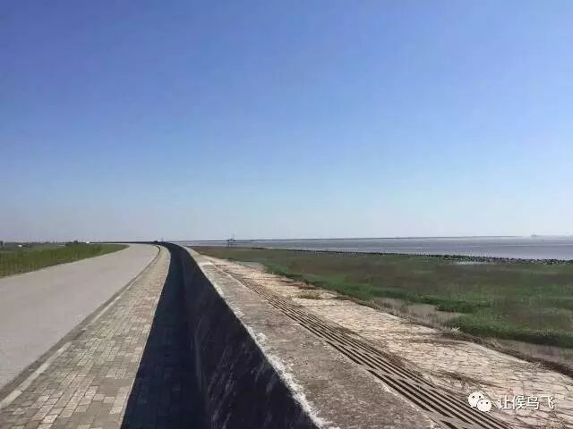 图中的道路是南汇东滩第四期大堤,右边是长满互花米草的潮间带(海水涨至最高时所淹没的地方开始至潮水退到最低时露出水面的范围)。互花米草这种疯狂生长的外来入侵植物是被特意种在这里,有利于围垦滩涂。