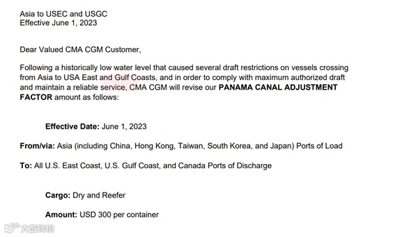 CMA也宣布6月1日起开征PANAMA CANAL ADJUSTMENT FACTOR: