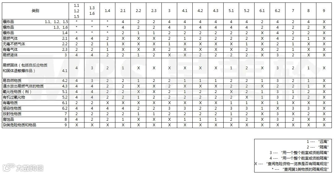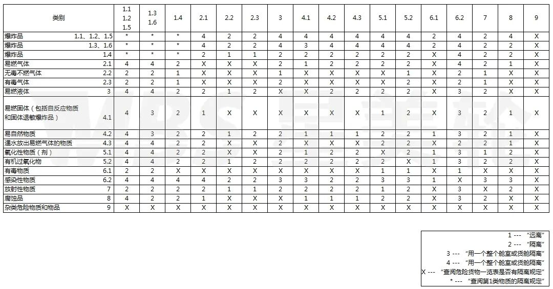 危险品拼箱相对于普通货物拼箱的装载和运输要求相对较严格。另外,部分危险品类别是不可混装,不同类别危险货物间的一般隔离规定可参考以下图表;但如货物特性差异较大,请参考危险货物一览表的相关规定。