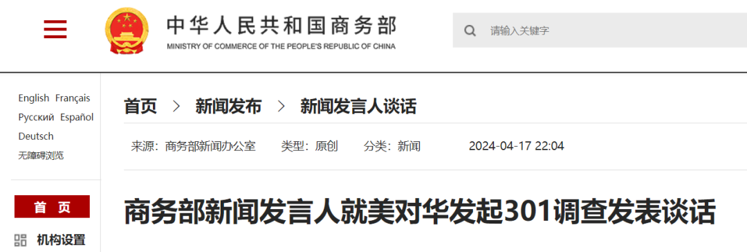 4月17日,商务部新闻发言人就美对华发起301调查发表谈话。