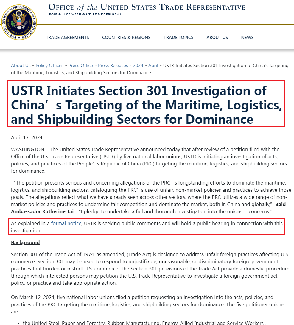 2024年3月12日,五家美国工会提交了一份请愿书,要求调查中国针对海事、物流和造船业主导地位的行为、政策和做法。
