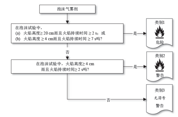 按照《全球化学品统一分类和标签制度》(GHS),气雾剂根据其易燃成分,化学燃烧热等,分为类别1(极易燃)、类别2(易燃)和类别3(非易燃)三个危险性类别。如果气雾剂所含易燃成分(按质量)≤1%,并且燃烧热<20 kJ/g,则该气雾剂为非易燃气雾剂(类别3),如果所含易燃成分(按质量)≥85%,并且燃烧热30≥ kJ/g,则该气雾剂为极易燃气雾剂(类别1)。不满足以上条件的气雾剂,喷雾气雾剂按照点火距离、燃烧热、封闭空间试验进一步分类,泡沫气雾剂则根据火焰高度和火焰持续燃烧时间继续分类。