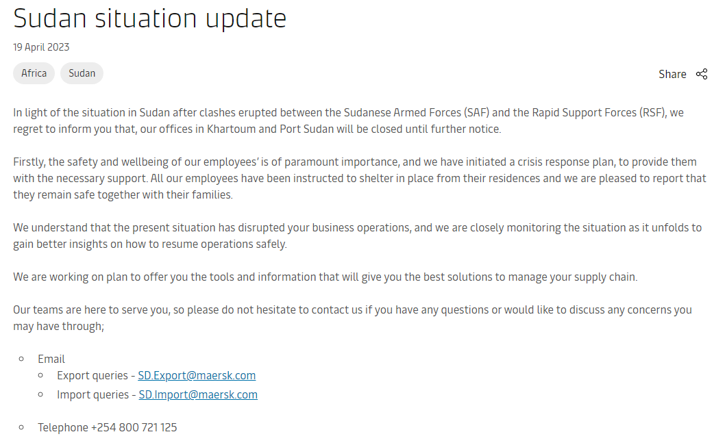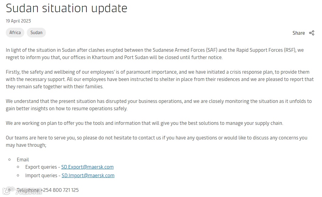 马士基于前几日发布通知,称鉴于苏丹武装部队与支援部队爆发冲突后的苏丹局势,马士基将暂时关闭在喀土穆和苏丹港的办事处,直至另行通知。