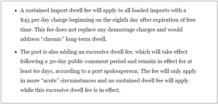这两项费用都将适用于休斯顿港口的 Barbours Cut 和 Bayport 两个集装箱码头,并且要求在相关集装箱从码头放行之前支付这些新费用。