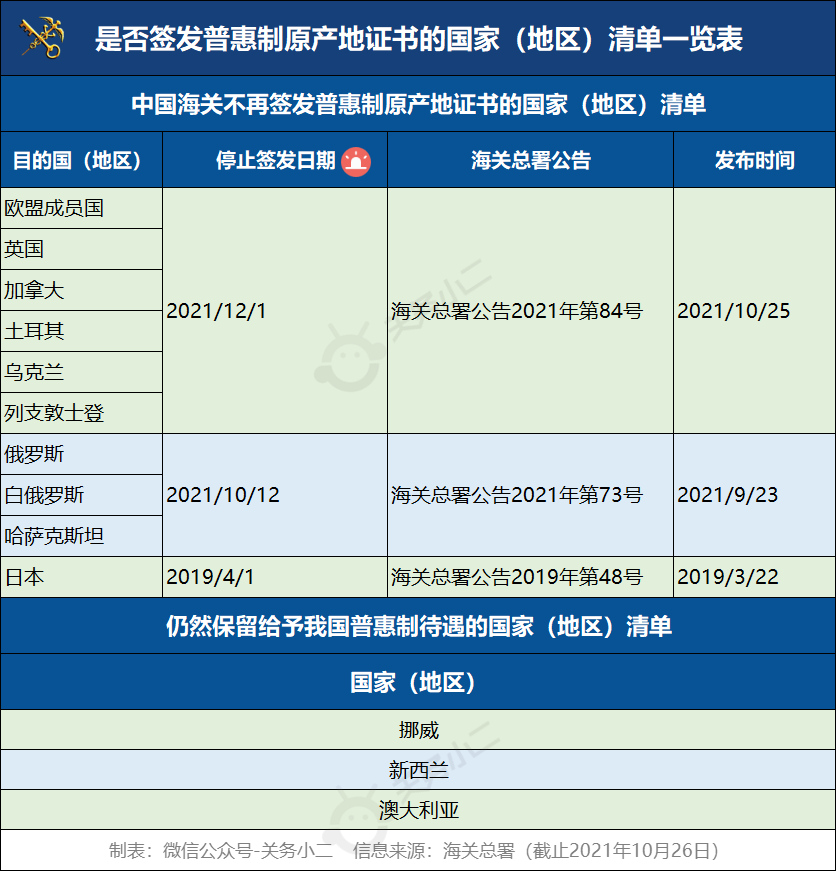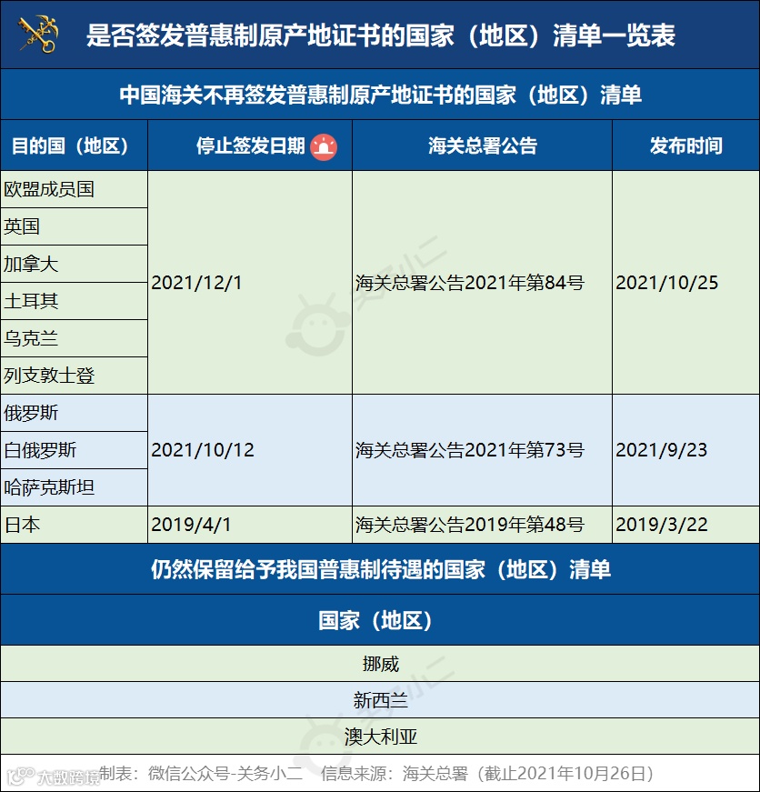 根据《中华人民共和国普遍优惠制原产地证明书签证管理办法》,海关总署决定,自2021年12月1日起,对输往欧盟成员国、英国、加拿大、土耳其、乌克兰和列支敦士登等已不再给予中国普惠制关税优惠待遇国家的货物,海关不再签发普惠制原产地证书。