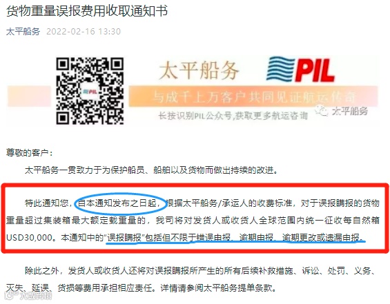 特此通知您,自本通知发布之日起,根据太平船务/承运人的收费标准,对于误报瞒报的货物重量超过集装箱最大额定载重量的,我司将对发货人或收货人全球范围内统一征收每自然箱USD30,000。本通知中的“误报瞒报”包括但不限于错误申报、逾期申报、逾期更改或遗漏申报。