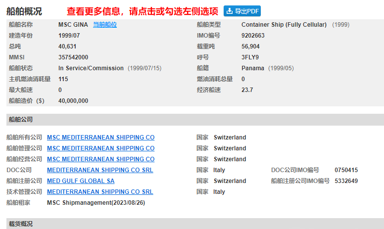 MSC GINA轮建造于1999年,运力为4056TEU,悬挂巴拿马旗帜,目前由MSC部署在EXTRA VESSELS航线上,该航线挂靠科伦坡(Colombo)、柏培拉(Berbera)、塞拉莱(Salalah)以及吉布提(Djibouti)等港口。