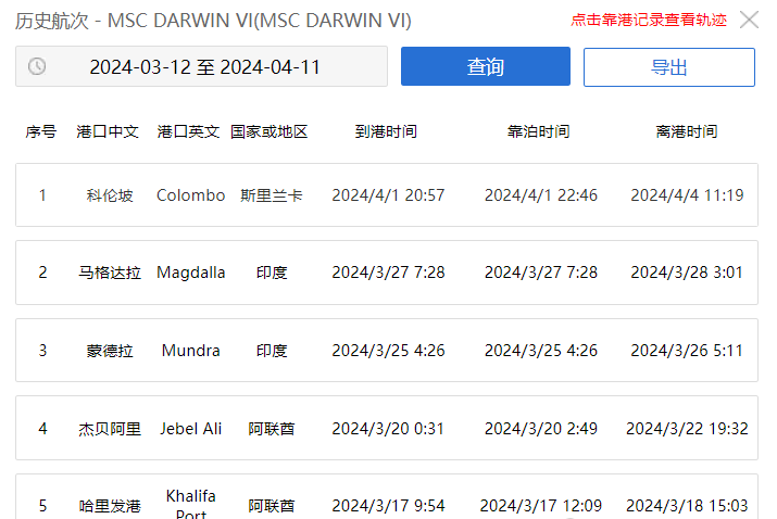 MSC DARWIN VI轮建造于1999年,运力为6078TEU,悬挂利比里亚旗帜,目前同样被MSC部署在EXTRA VESSELS航线上,此前曾挂靠科伦坡、蒙德拉、杰贝阿里等港口。