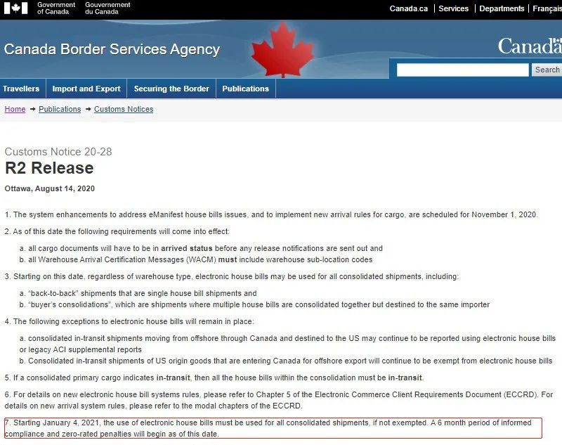 加拿大海关明确表示针对加拿大进口货物,必须由各级货代(NVOCC/Freight forwarder)自行提交eHBL数据,不再接受船司代申报ACI S10信息。