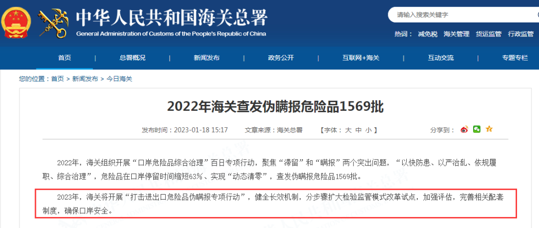 2023年,海关将开展“打击进出口危险品伪瞒报专项行动”,健全长效机制,分步骤扩大检验监管模式改革试点,加强评估,完善相关配套制度,确保口岸安全。